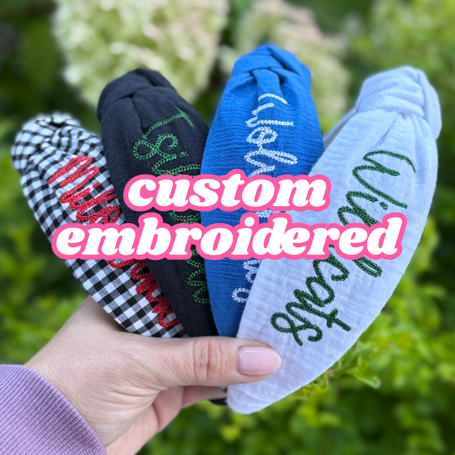 Add names, teams, or special sayings to your favorite headbands with custom embroidery. Perfect for gifts, spirit wear, and one-of-a-kind style.