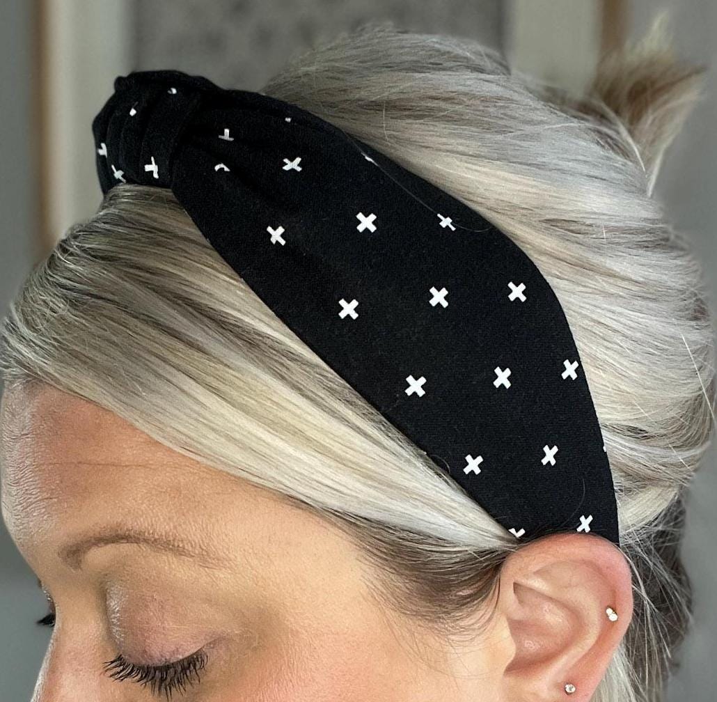 Add a touch of modern minimalism to any outfit with this handmade topknot headband! Crafted from soft black fabric featuring crisp white crosses, it’s versatile and stylish for everyday wear. Perfect for keeping hair out of your face while looking effortlessly chic, this headband is both comfortable and trendy. Ideal for gifting or as a unique addition to your accessory collection!