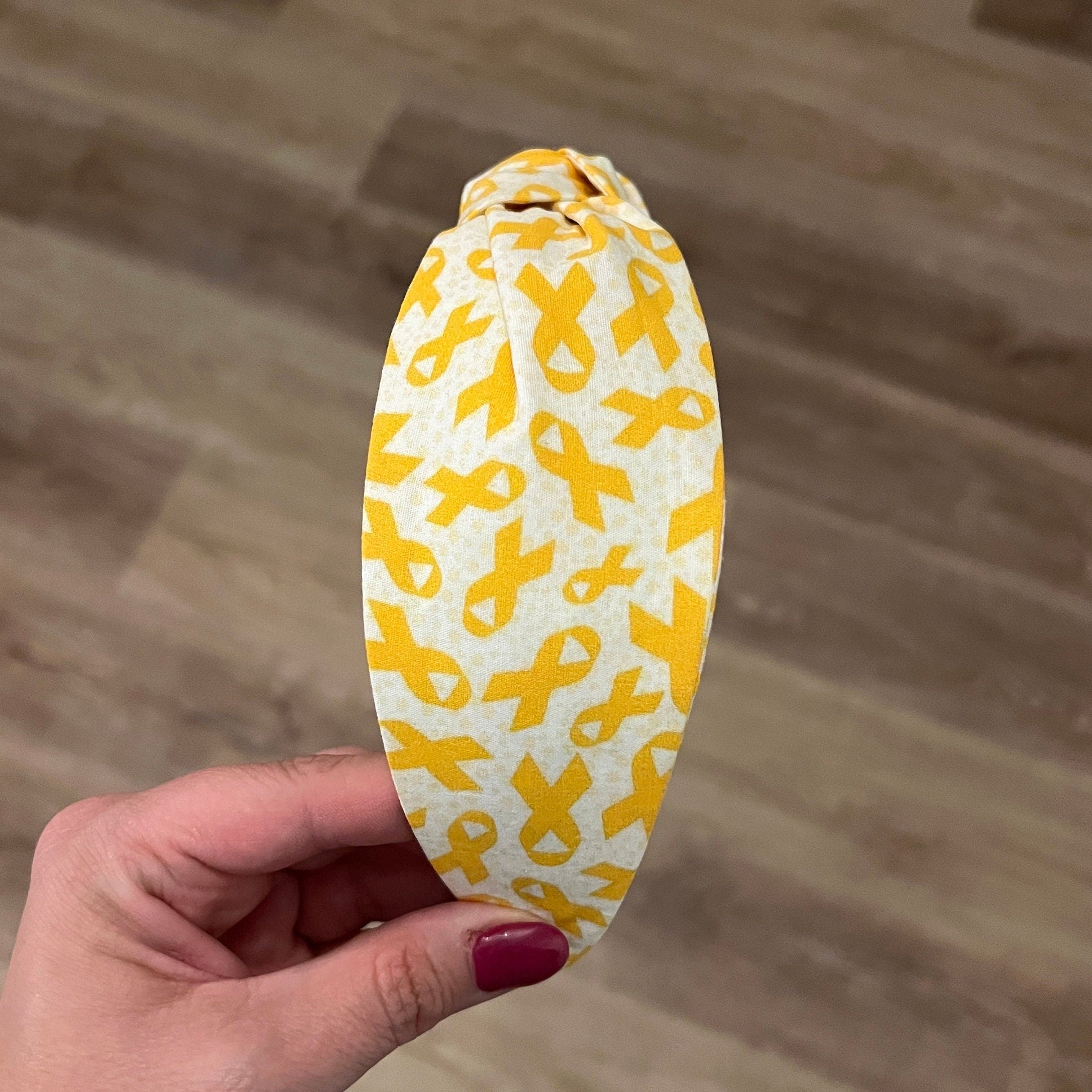 Show your support for a meaningful cause with this beautiful handmade topknot headband featuring white cotton fabric adorned with yellow ribbons, the symbol of Childhood Cancer Awareness. Perfect for adding a touch of style to your outfit while raising awareness and showing solidarity with the brave children and families affected by childhood cancer.