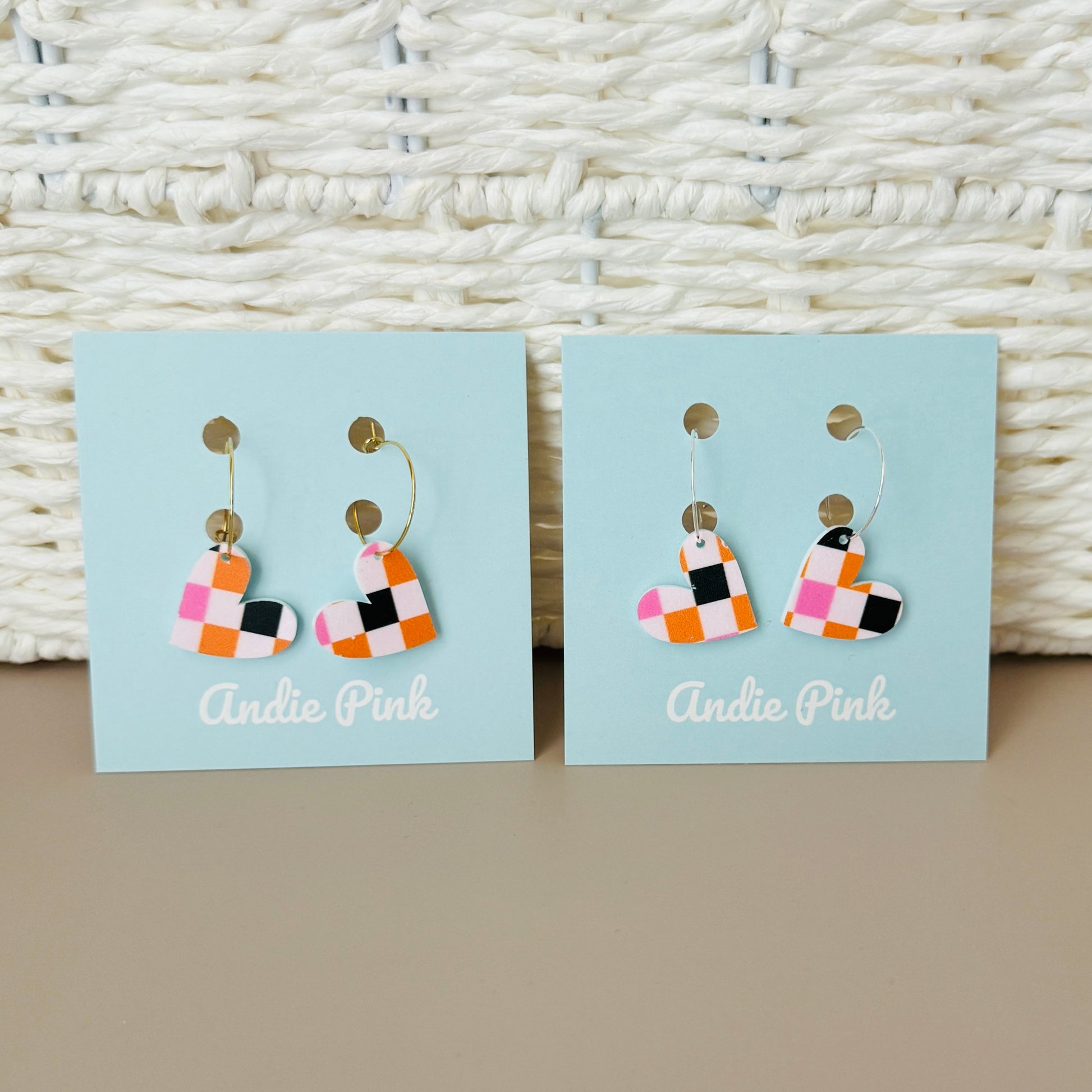 These adorable arch earrings are made out of lightweight acrylic and feature an adorable pink, black, orange, and white checkered Halloween pattern. with ghosty, pumpkins, and other cute Halloween things. Your choice of silver or gold hoops.
