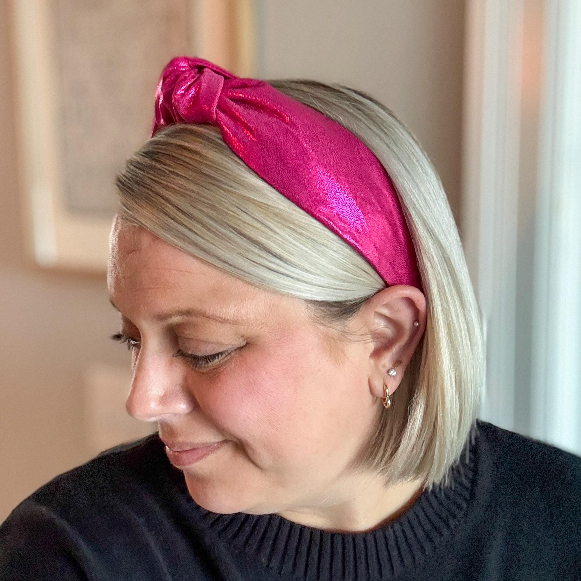 Shine bright with our Hot Pink Metallic Topknot Headband, designed to add a vibrant pop of color and comfortable hold for women and girls ages 5 and up. Unlike ordinary headbands, this bright pink accessory combines bold style with all-day comfort, making it a standout choice for any casual or festive outfit.
