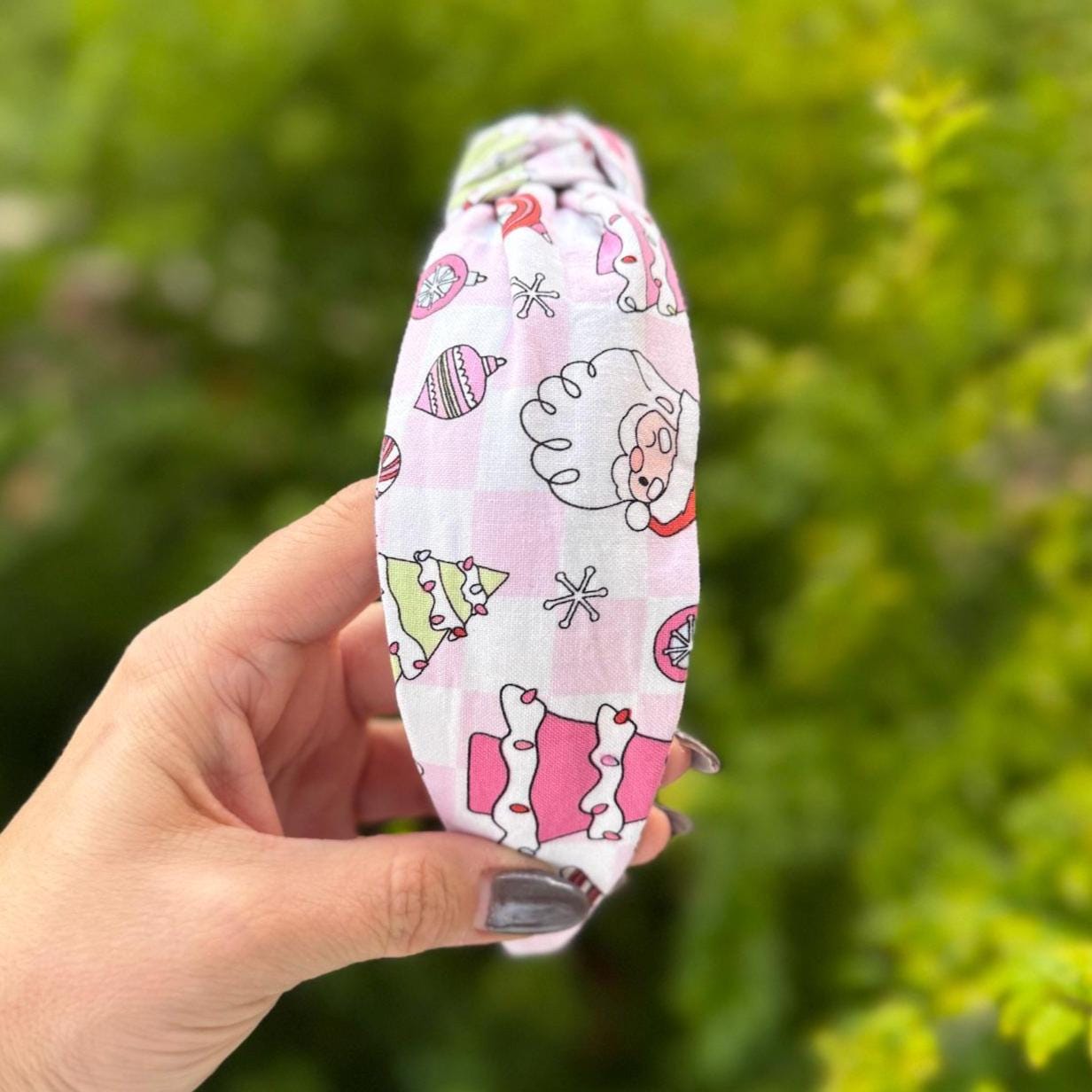 Bring a little festive cheer to your look with this Pink & White Christmas Check Topknot Headband — handmade with premium holiday fabric and finished with our signature pink-wrapped base for that unmistakable Andie Pink touch.