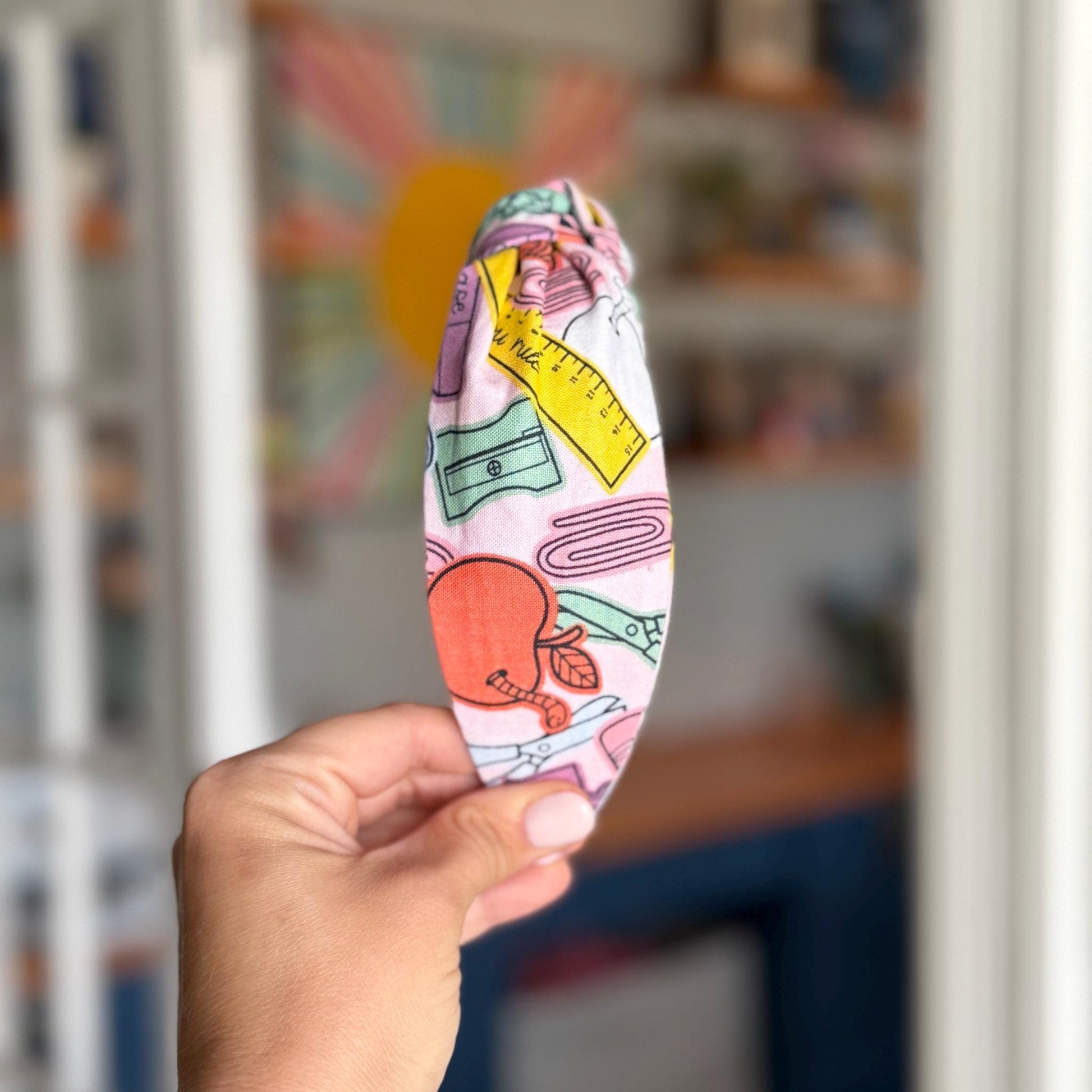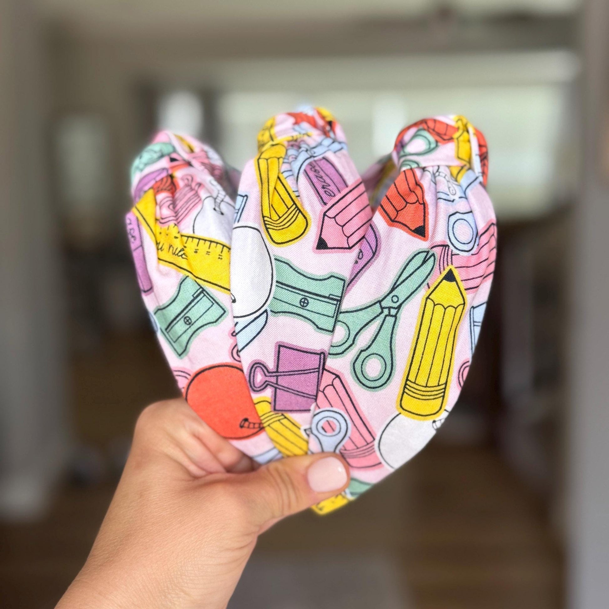Add a playful and practical touch to your daily style with this charming teacher-themed headband, featuring a delightful pink school supply pattern, perfect for women and girls aged 5 and up. Crafted with care, this handmade topknot headband combines comfort and fun, making it an ideal accessory for teachers, students, or anyone who loves a pop of school-inspired flair.